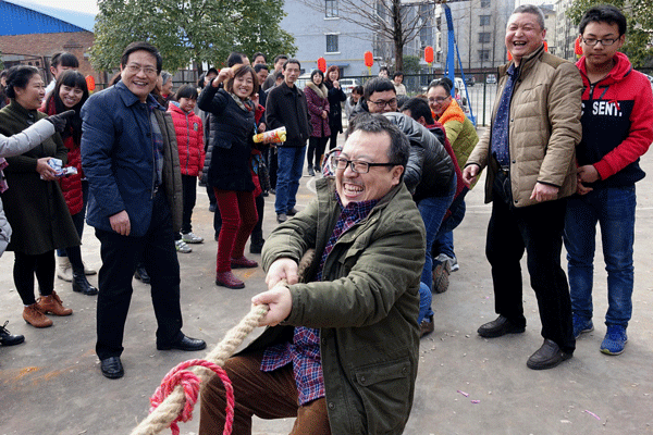 活動(dòng)在震天的煙花爆竹聲、歡慶的鑼鼓聲、歡快的秧歌舞中拉開了序幕,工會舞蹈興趣組的女職工身穿紅色節(jié)日裝,手提紅燈籠進(jìn)行了喜慶方隊(duì)的表演;參加游藝活動(dòng)的職工、家屬已有序在各項(xiàng)活動(dòng)前排好了隊(duì),飛鏢、搶凳子、定點(diǎn)投籃、齊心協(xié)力,皮球入門、盲人敲鑼、釣魚、套環(huán)、擲沙包、筷子入瓶等刺激好玩的游戲逐一展開,每種游戲項(xiàng)目都吸引了許多職工、家屬參加,大家爭先恐后,積極踴躍參加,現(xiàn)場人頭攢動(dòng),氣氛熱烈,笑聲不斷。搶凳子吸引了大批兒童,既要跑起來又要聽裁判的敲鑼聲,小朋友們扎實(shí)秀了一把;三人配合項(xiàng)目體現(xiàn)了齊心協(xié)力合作精神……;再看各分會拔河隊(duì)員個(gè)個(gè)鉚足了勁,使盡渾身力氣參與較量,呼喊聲、加油聲一浪高過一浪,笑聲、加油聲互相映襯,此起彼伏。多姿多彩的文化活動(dòng)將節(jié)日氣氛推向了高潮。