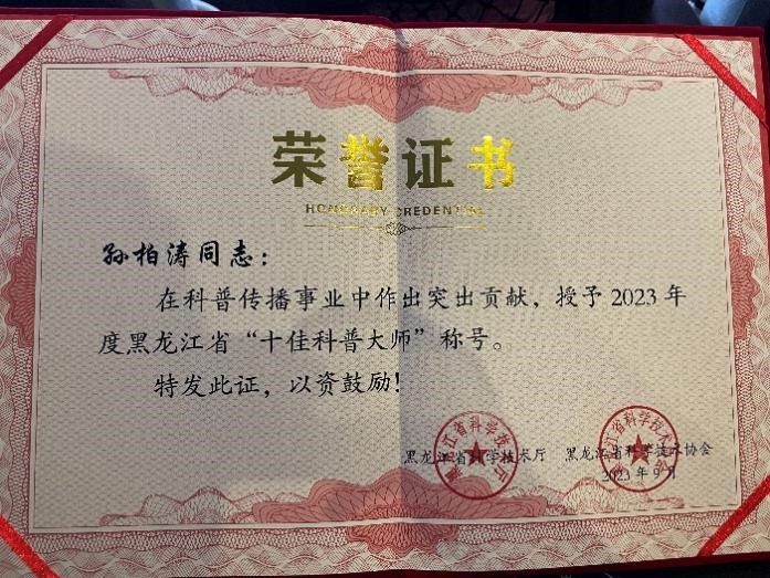 我所孫柏濤研究員榮獲2023年度黑龍江省“十佳科普大師”稱(chēng)號(hào)
