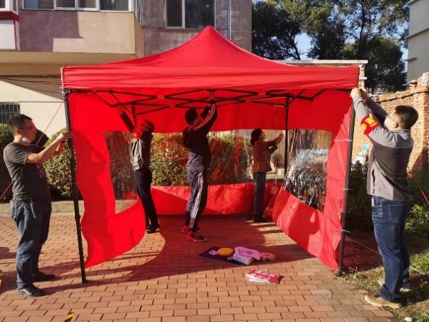 在全員核酸檢測時,工力所社區(qū)居民多已年長,部分人員身體狀況不佳,長時間排隊情緒容易焦躁,體力也吃不消。對此,現(xiàn)場工作組積極協(xié)調,第一時間為社區(qū)提供塑料座椅,供居民臨時休息。現(xiàn)場工作人員長時間指揮嗓子干啞,支部立即調配擴音器、引導線等,輔助維持現(xiàn)場秩序。聞息近期有雨,又緊急增配雨衣,以免影響檢測工作。接到第四輪核酸檢測點遷移指令后,工作組又緊急集結,在居民區(qū)空地搭設帳篷,設置排隊引導線、隔離樁,調試設備設施,有效保證核酸檢測工作順利進行。