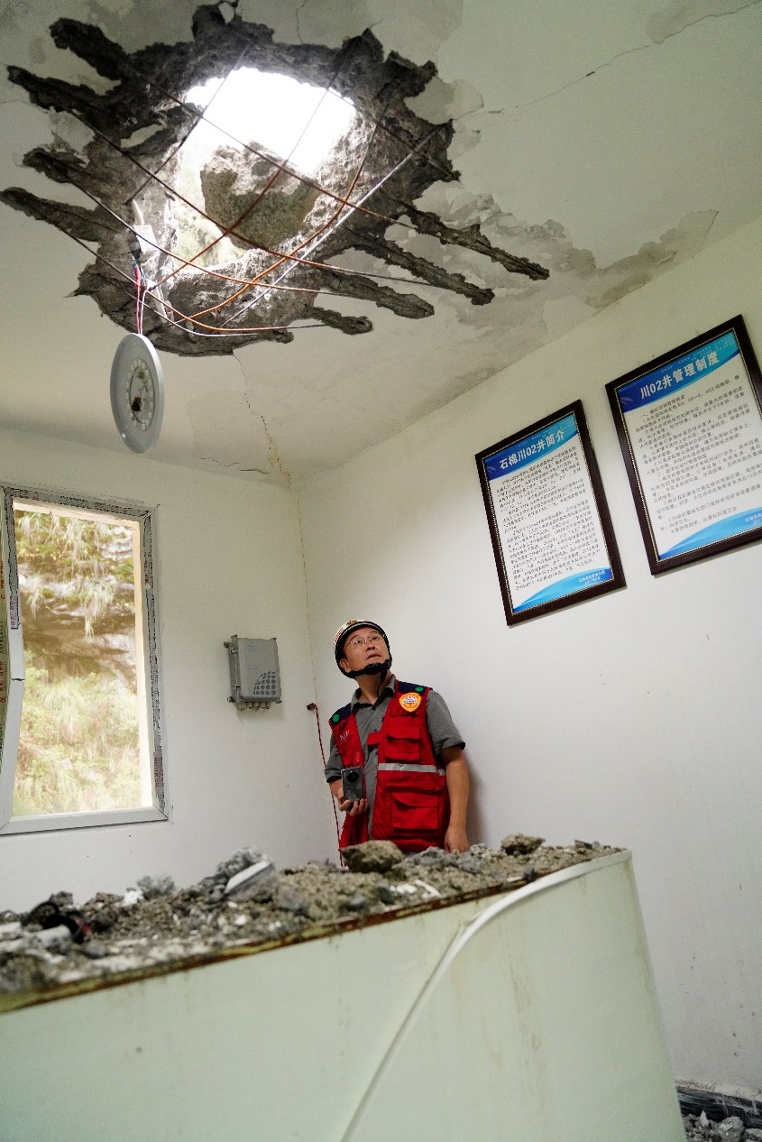 石棉線科考組圍繞石棉川02井、擦羅強震臺站、栗子坪強震臺站開展了周邊建筑震害調查。該區域儀器烈度與實際建筑破壞程度基本相符,考察區域的大部分震害為非結構構件的破壞,如框架結構填充墻開裂、瓷磚脫落等。科考組考察到的2008年汶川地震后援建的中小學校舍在此次地震中表現良好,幾無震害。個別房屋出現了屋蓋和墻壁被落石直接擊穿的震害。