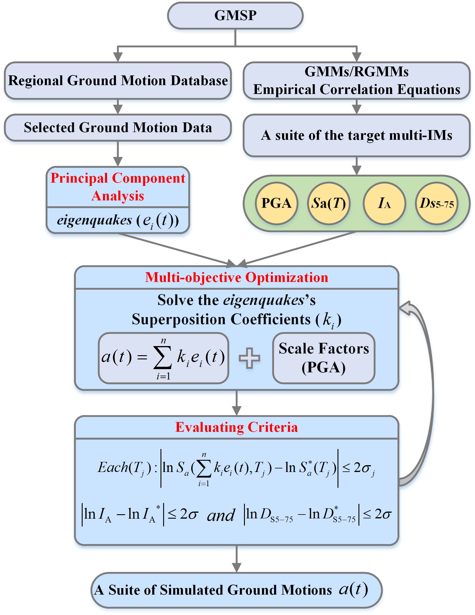 本研究構(gòu)建了一套基于特征提取匹配多強(qiáng)度指標(biāo)的地震動(dòng)模擬程序(GMSP,見(jiàn)圖1)。該地震動(dòng)模擬程序的目的是在設(shè)定地震情景下為單一場(chǎng)點(diǎn)生成一組充分考慮地震動(dòng)幅值、頻譜、持時(shí)和累積能量的加速度時(shí)程。多個(gè)標(biāo)量地震動(dòng)強(qiáng)度指標(biāo)被選取建立了目標(biāo)矢量強(qiáng)度指標(biāo)([IA, DS5-75, PGA, SA(T)]),該矢量強(qiáng)度指標(biāo)被用于在模擬過(guò)程中控制擬合優(yōu)度。GMSP通過(guò)將一組實(shí)際地震動(dòng)記錄經(jīng)主成分分析方法(PCA)特征提取后得到一組標(biāo)準(zhǔn)的正交基向量,即eigenquakes。采用多目標(biāo)遺傳算法結(jié)合約束條件進(jìn)行迭代尋優(yōu),求解每個(gè)eigenquake對(duì)應(yīng)的線性疊加系數(shù)。最終,在時(shí)域上完成縮放疊加得到模擬地震動(dòng)記錄。