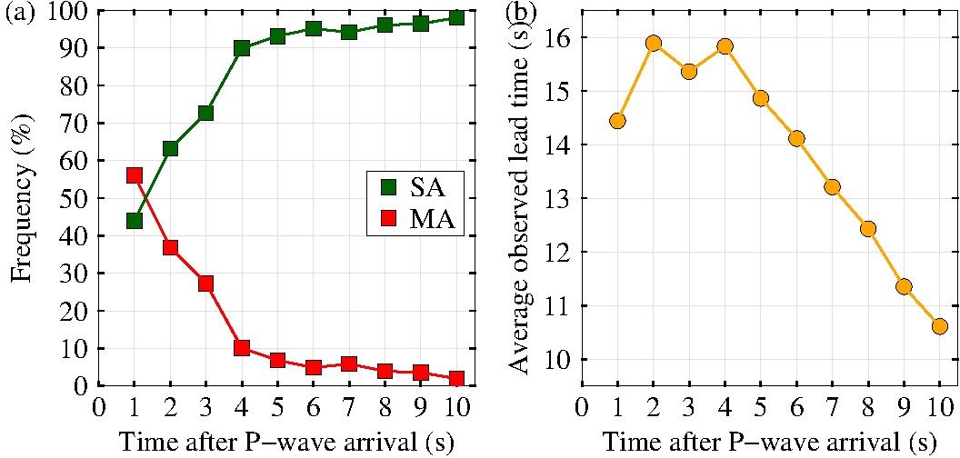 5次地震事件,在潛在破壞場地中,圖P波到達后時間窗的關系。從圖a)中可以看到:隨著P波到達后60%。此外,在10秒時,成功報警率超過2%。從圖b)中可以看到:當在4秒內,平均觀測預警時間超過P波到達之后時間的增加而逐漸減小。在10秒時,平均觀測預警時間仍超過