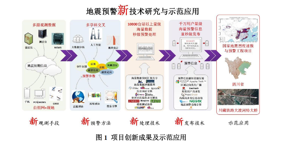 項目緊緊圍繞國家重大建設項目“國家地震烈度速報與預警工程”實施中亟待解決的關鍵科技問題,針對確定地震預警參數的“快和準”問題和地震預警系統建設的技術需求,按照“理論研究—技術研發—系統研制—示范應用”的一體化實施路線,基于人工智能、大數據分析等先進新興技術,通過3年多的科研攻關,實現了“新觀測手段、新預警方法、新處理技術、新發布技術”的“四新”創新點,并在四川、云南、京津冀以及川藏鐵路成功進行了示范應用。