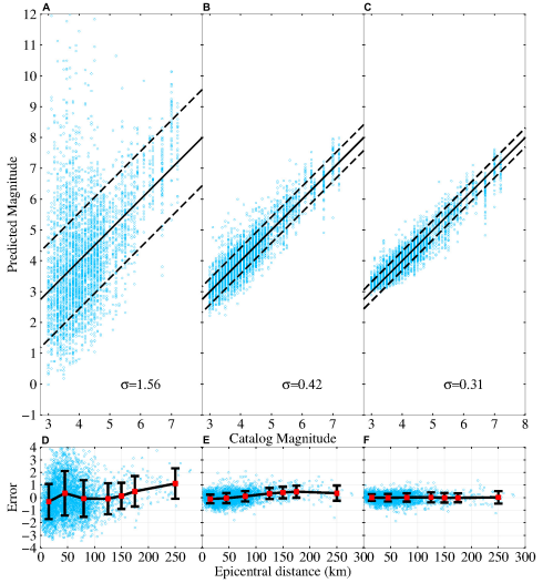 圖2 P波到達(dá)后3秒,(A,D)Tc方法、(B,E)Pd方法和(C,F)DCNN-M模型的震級(jí)估計(jì)