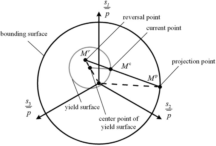 1.本文首先提出了一個便于工程應用的三維土體彈塑性本構模型。本模型基于邊界面模型理論,在歸一化偏平面中建立投影法則給出應力狀態參量(見圖1);采用土體材料模量與圍壓的經驗關系描述圍壓改變引起的土體模量變化;并根據偏應力不變量建立應力等效關系,將一維Pyke模型拓展到三維應力空間并以此推導塑形模量(見圖2)。