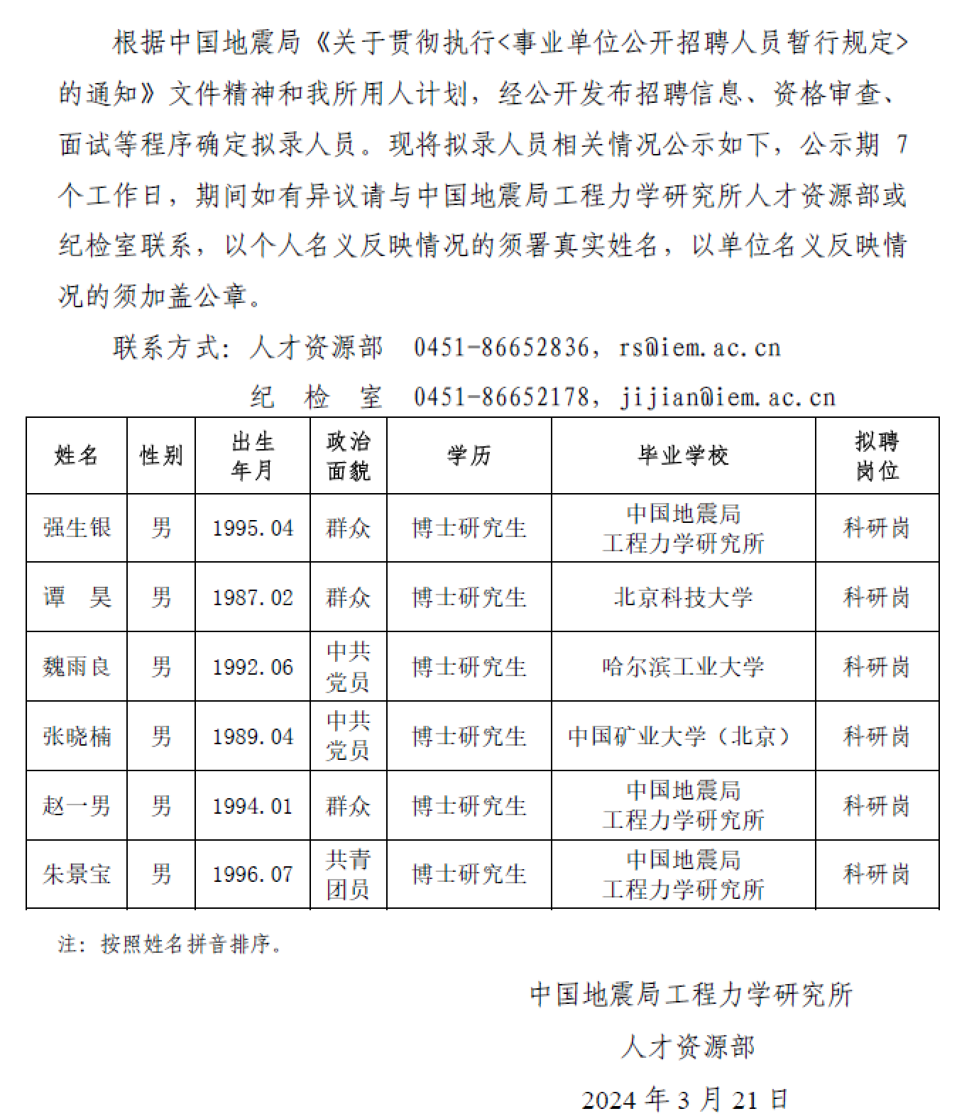 中國地震局工程力學研究所2024年擬錄用人員公示(二)